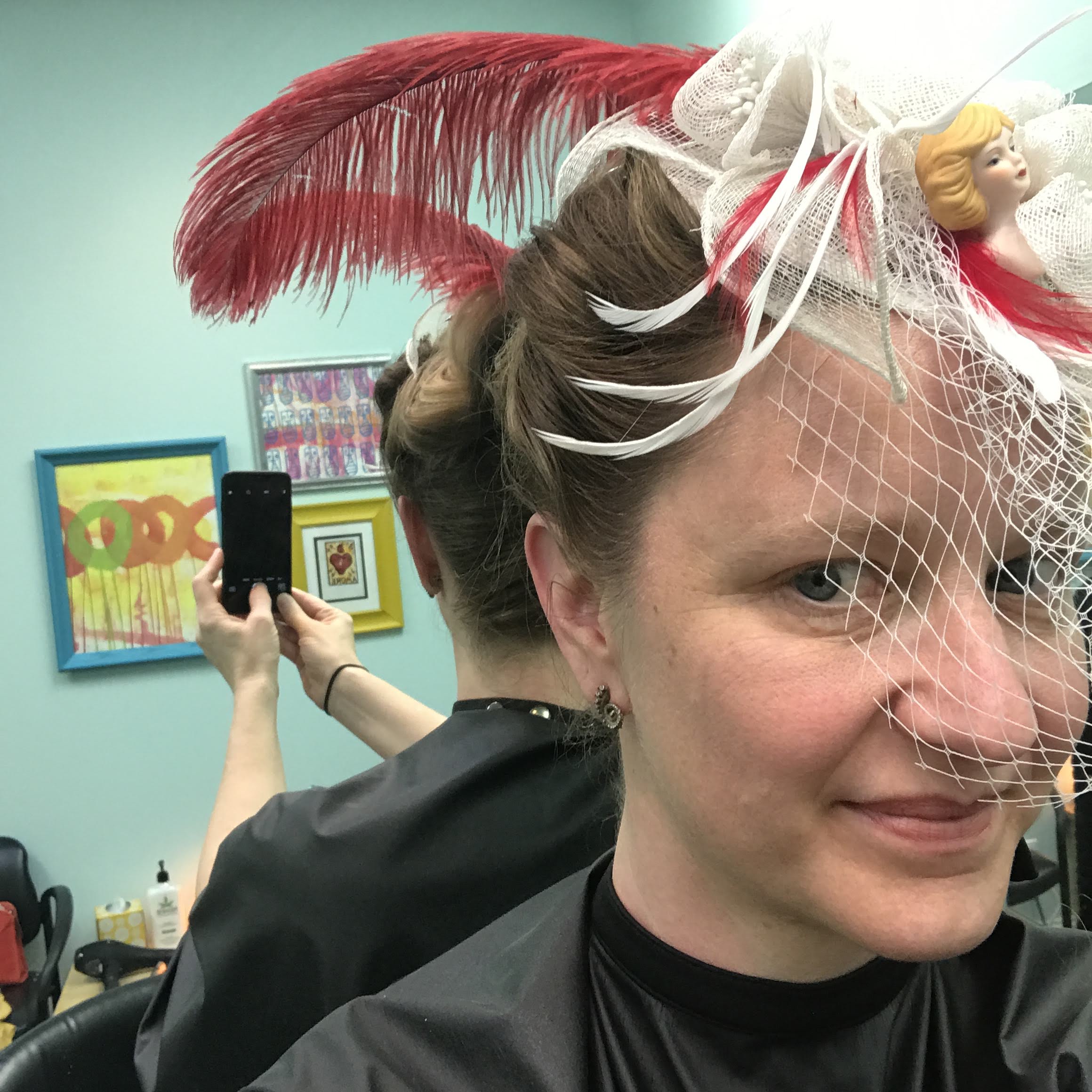 As an adult, I’ve continued to find ways to play Dress Up. Ironically, I don’t like Halloween because dressing up is expected. I’d rather be prompted by a motif somewhere in my life. I’ve worn a Marie-Antoinette-inspired hairstyle with nesting creatures to a friend’s animal-themed art opening and a 1930s-inspired skirt and hat on a Route 66 road-trip.